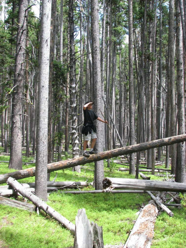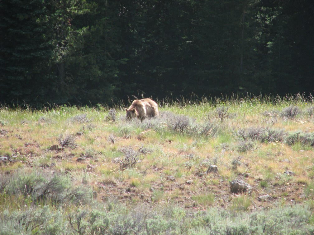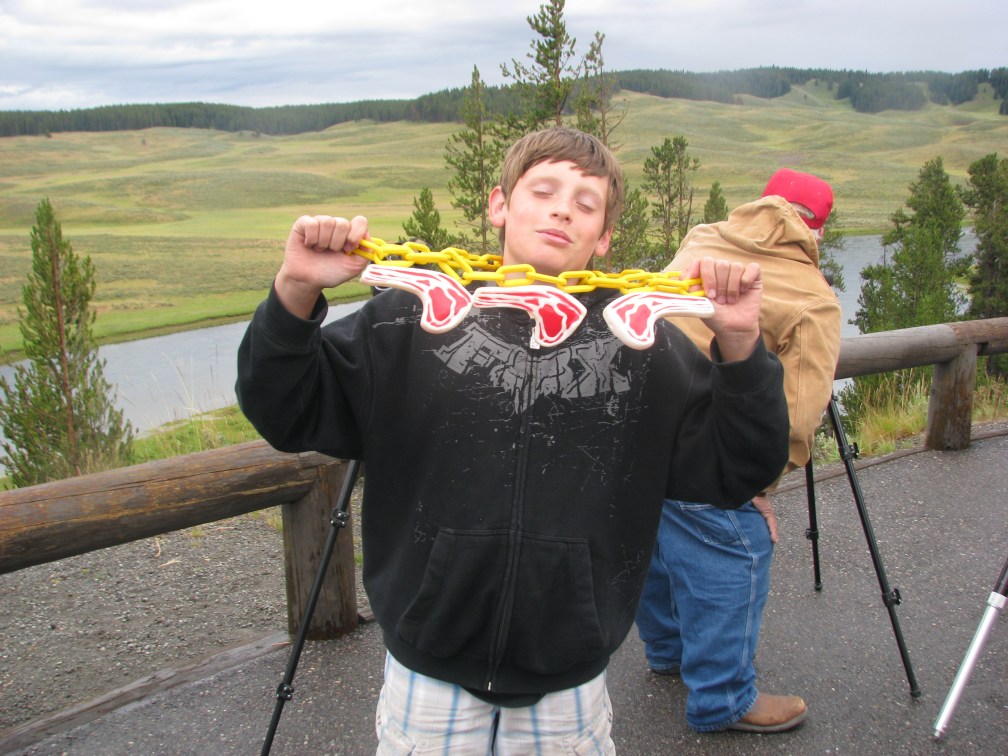 Yellowstone attracts “grizzly groupies”: middle aged men from around the country who spend their annual vacation sitting in lawn chairs at look-out points with kick-ass cameras and telescopes seeking the perfect grizzly sighting.  Our son, then 12, loves wild animals and enjoyed learning from these guys while patiently waiting for an appearance.   They made him “honorary bear bait” by hanging pork chops around his neck.