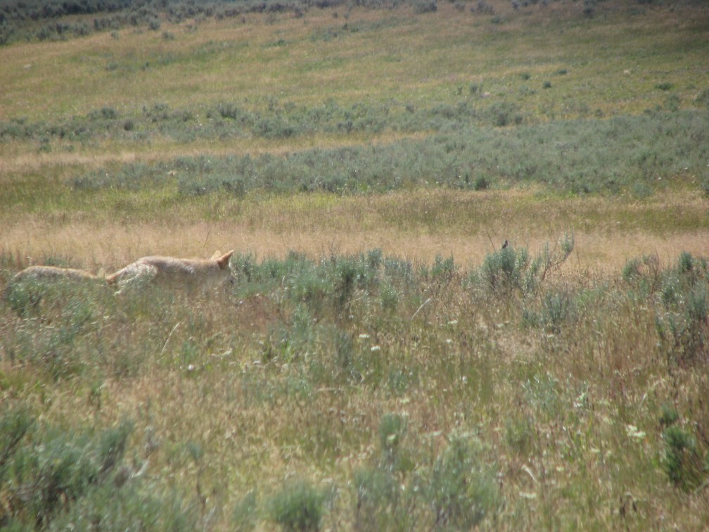 Our favorite animal encounter was actually at Yellowstone Bear World , a drive-through zoo just north of Idaho Falls.  Your truck windows get super close to all sorts of bears, wolves, elk, etc.  We were towing our trailer and didn’t realize that we still had bacon grease cooling in a frying pan that had been tucked into the back.  While we were inadvertently chumming for carnivores, a grey wolf took our bacon-scented spare tire cover!  An employee was happy to return it to us, but it came back with a lot of holes chewed through.  We kept that tire cover for as long as we kept our trailer.  It looked shabby, but it was a great memento of our camping pilgrimage to Yellowstone.
