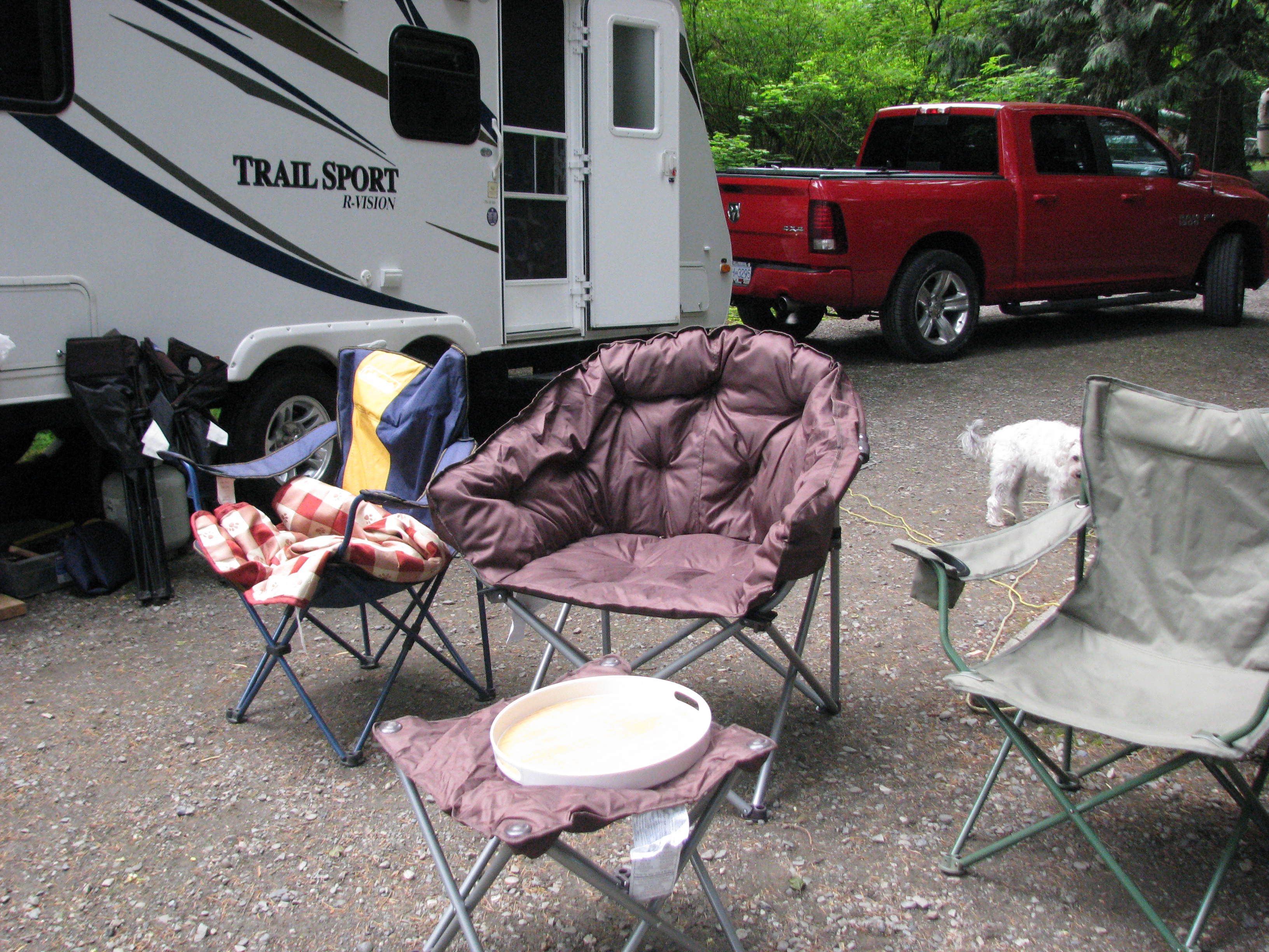Mishaps (of course): Our site was quite sloped so it was challenging to get the trailer off the hitch. The weight of the trailer pulling back on the hitch made this impossible so we had a great idea (that means mistake.) With the jacks down we backed the trailer up an inch just to alleviate the pressure. Yes you heard me right, but it worked so we happily went about levelling the trailer. Well, I guess the wheel blocks weren’t in place right so the next thing that happened was the trailer starting to slip down the slope ( I can feel the collective gasp already, that was me as well). It didn’t move much but enough to bend 3 of the 4 jacks and caused me to panic and make my husband enlist the neighbour for wood blocks. Trouble averted, trailer level and jacks repaired, it was time for a much needed glass of wine and some dinner. This is why we would never set up at night.