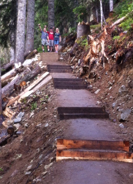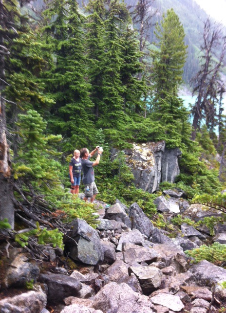 From there you head to the second upper lake which is about 4 km away. Now the word upper should have been our hint but we didn’t really think about it. Blair causally mentioned he had heard it was an up hill hike but that it wasn’t bad, so off we went. At about 1/2 a km we started to ascend. At first it was a slow gradual climb but soon we realized our tickers were in for a work out. The steep ascent is only about 2 km but we all found it challenging as demonstrated by the lapse in conversation while we used our energy to walk. To help with your footing the park provided steps that enclosed many of the rocks but these were high steps and tough on your cardio and leg muscles. The trail is an “up and back” route so we passed several other hikers coming down but I wouldn’t say it was a busy hike. It was also Monday so that likely helped with the traffic and allowed us to set our own, easy, pace. After the 2 km steep stair master climb we levelled off back to a moderate trail slope that guided us to the lake.