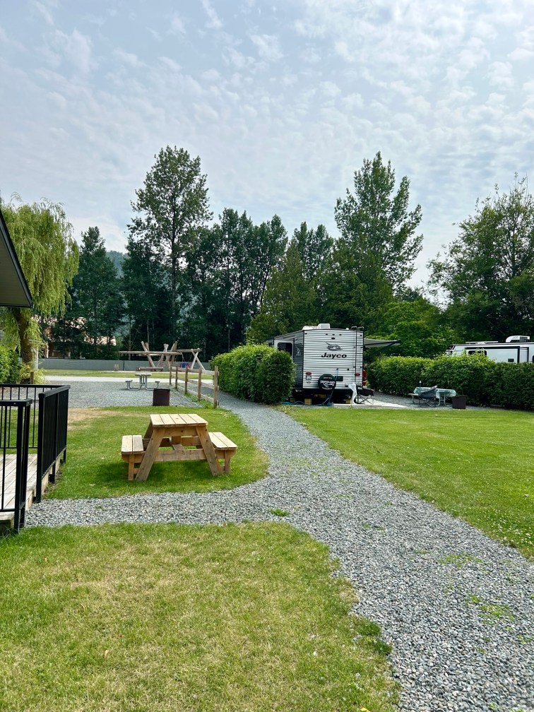 Pathfinder Agassiz is a small campground located a short drive from Agassiz and Harrison Village. It has 32 sites, most are full hook ups, as well as 8 cabins. The campground is set up as a square with sites around the perimeter. Most sites back onto the center green space.