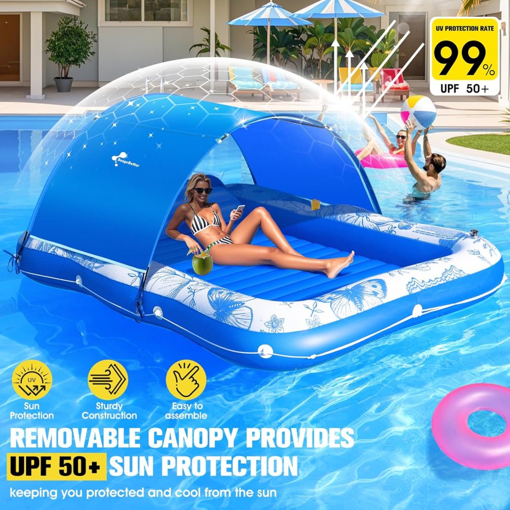 This year we planned ahead and brought more shade with us. We purchased the COOLCOOLDEE Pool Lounge Float from Amazon to try out. It appeared to be the best of both worlds, a large floating lounger with a removable UPF50+ canopy.
